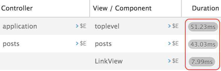 To see how a template was rendered by Ember, click on the template in the View Tree. If you're using Chrome or Firefox, you'll be sent to the Elements panel with that DOM element selected.